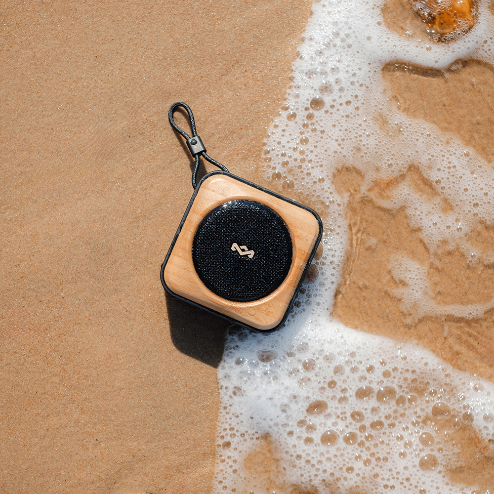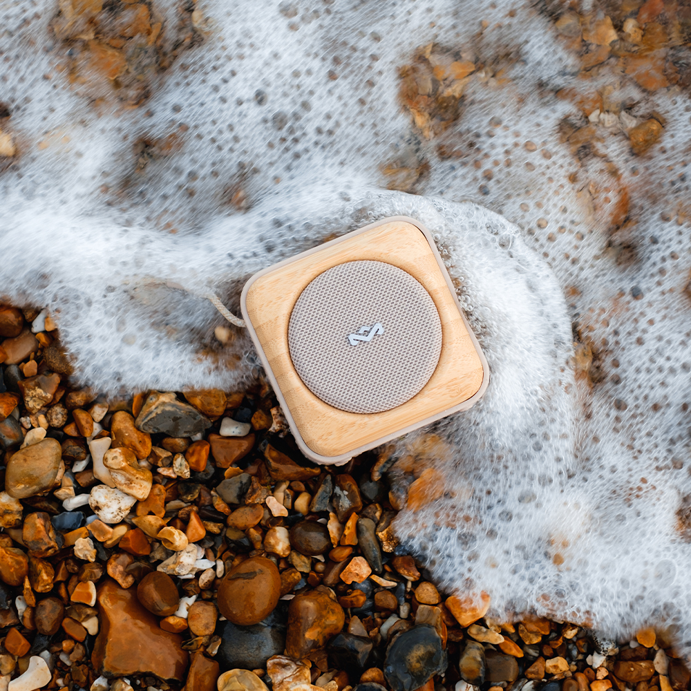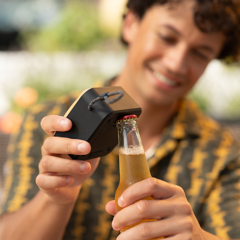 コンパクトながらもパワフルなサウンドを再現。2つのスピーカーをペアリングして再生することも可能です。ワイヤレスレンジは約15メートル。ボトルオープナー搭載。