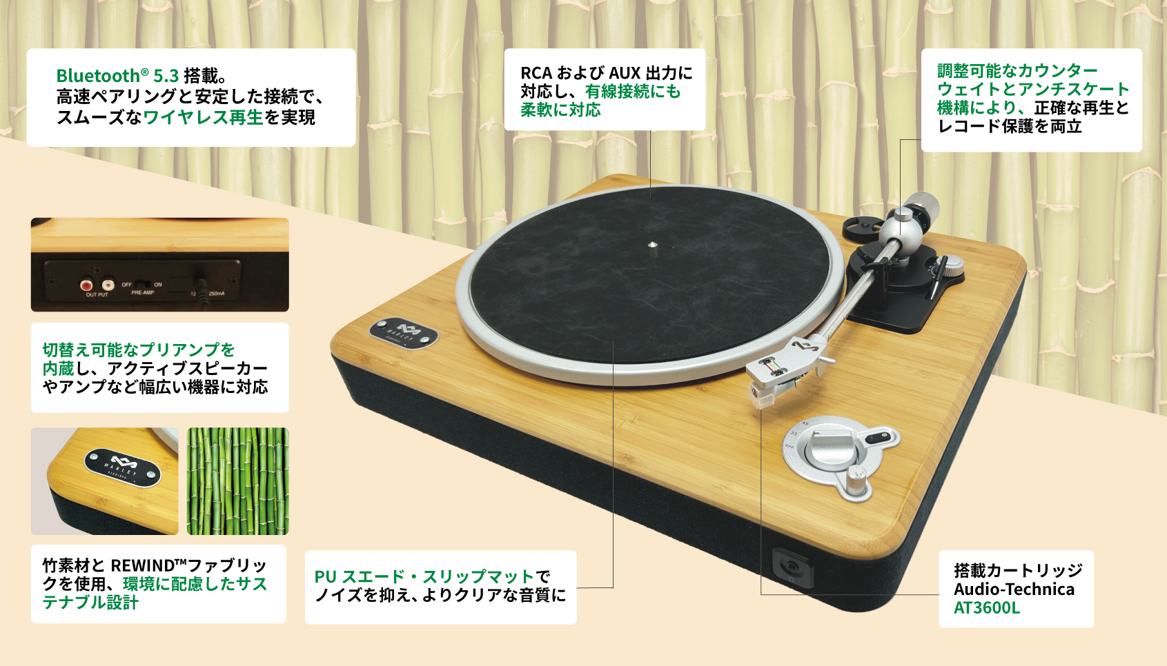 House of Marley のすべての製品は、音楽の本質と深くつながる、没入感のあるオーディオ体験をお届けするためにデザインされています。天然素材の採用から、レコード本来の味わい深い音を引き出す精密設計のトーンアームやカートリッジに至るまで、細部にまで徹底してこだわりました。そして完成するのは、卓越した音響性能、時代を超えて愛されるスタイル、そして地球にやさしいクラフトマンシップが美しく調和した一台です。